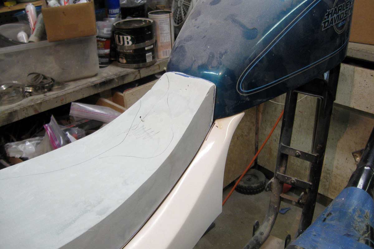 Here are two shots of the foam pattern. When that’s done I’ll finish the pattern for the fender support bracket/brakelight & license plate holder which has already been started. This has been a very long process and I’m sorry but I’m distracted by so many other concurrent projects. (I have the new style black side left side covers in stock if you want to replace that metal crap that holds the battery in.)
