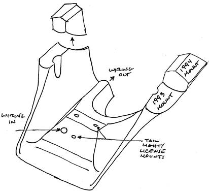 The photos show the support in the “94” shape. The drawing shows how we cut off the 94 mount and presto the lower 93 mount is exposed. I don’t know if other motorcycle glass guys make molds this complex but I expect not. The whole idea behind this ‘thing’ is not to show any hardware being exposed on the outside of the tail. Others show hardware because it’s cheaper and simpler. Not us boy--we take the long way round the barn. But the net effect is a cleaner looking product.
