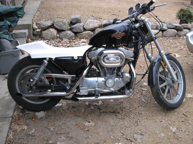 Here’s the start. An 1988 with a claimed 26,xxx miles but the title said “Odometer Status Exempt.” I don’t know what that means but it’s probably not good. Rear tires were showing cords so it’s done its share of burn outs. Hope the rings aren’t toast. Notice the skeleton bar pegs-is that cool or NOT! I’m building it as a short track racer that I’ll use on the street too. I’ll just pull the plate and unhook the front brake lever. It will never see a Hooligan track because I think a 1/8 mile track is for mad men. I’m an old slider and you can’t use that advantage on an 1/8mile. As this thing comes together I’ll shoot out reports.