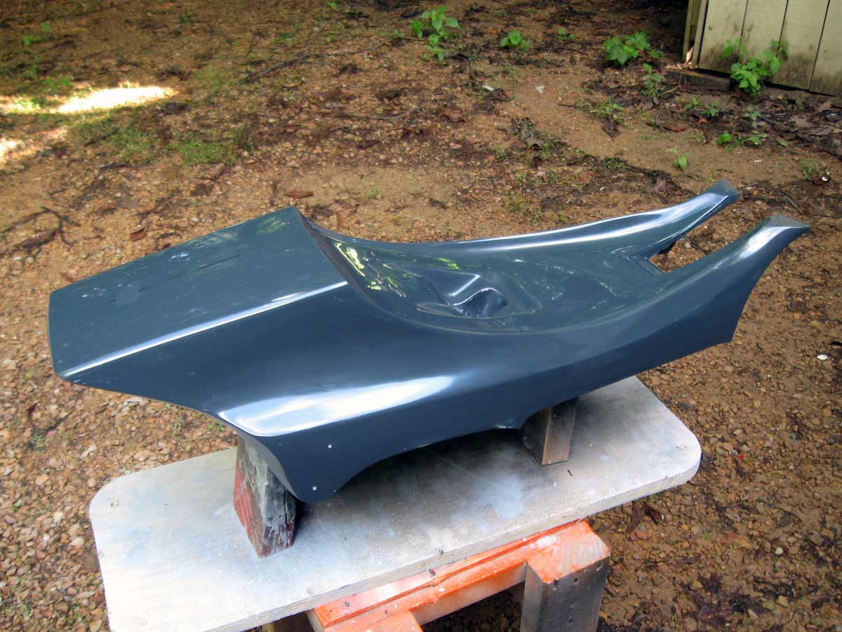 When I say two-part notice the hairline split mid way. We spray in the gelcoat and fiberglass matrix and after it cures we dissemble the mold and pull out the part. The fender has so many curves and negative drafts that this is the only way to handle it. More soon I hope.